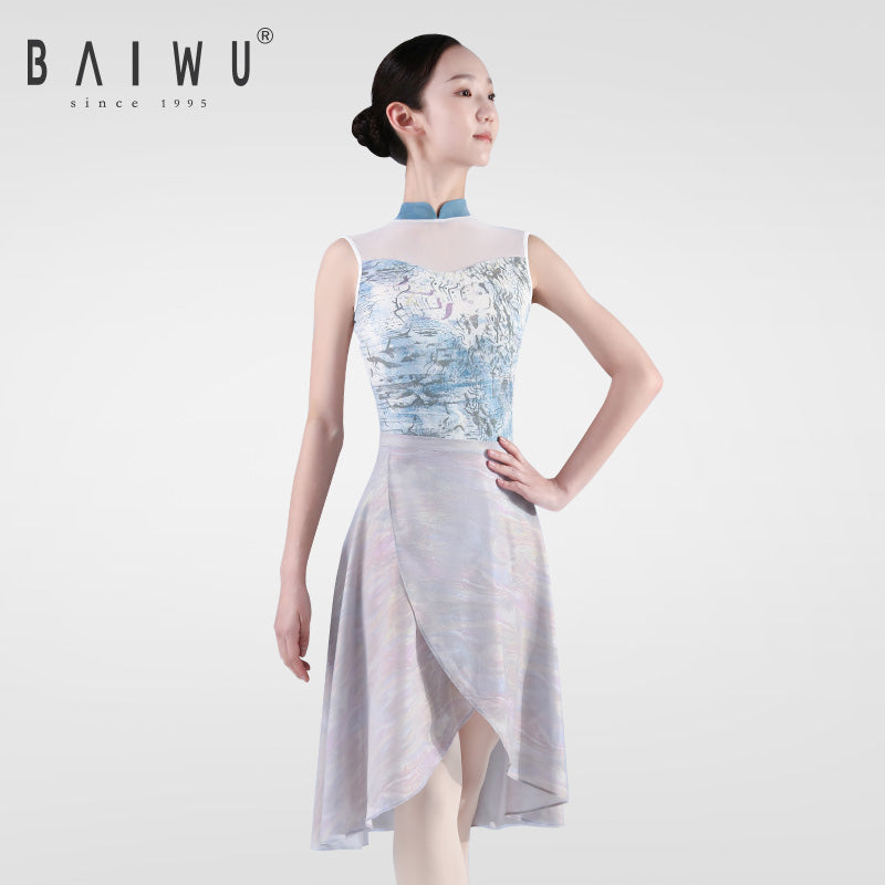 Striking and sophisticated, this sleeveless ballet leotard combines refined design with artistic expression. Featuring a high Chinese collar and a painterly ink print, it captures the fluidity and grace of movement. A soft mesh overlay frames the neckline and extends into the back, where a unique cross-mesh detail highlights an elegant oval-shaped backline.