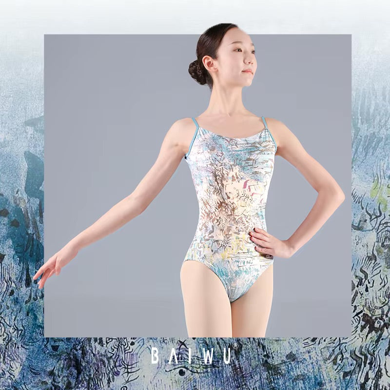Elegant and expressive, this ballet leotard features delicate thin straps, a graceful scoop neckline, and a low V-backline accented with subtle ruching for a beautifully refined silhouette. The eye-catching ink print adds a modern, artistic twist—bringing individuality to your studio or stage look.