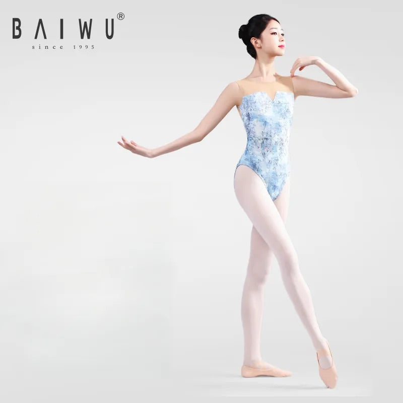Refined and expressive, this sleeveless leotard features a flattering mesh V-neckline that flows effortlessly into a low V-back, finished with delicate ruching for an elegant touch. The artistic ink print brings a contemporary flair to a timeless silhouette—perfect for the dancer who wants to stand out with subtle sophistication.